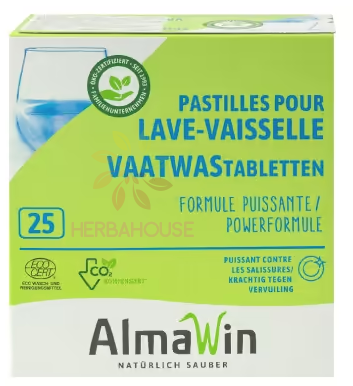 Almawin EKO tablety určené do automatických myček nádobí. Přírodní enzymy pomáhají účinně a šetrně odstranit zbytky jídel a jiné nečistoty.