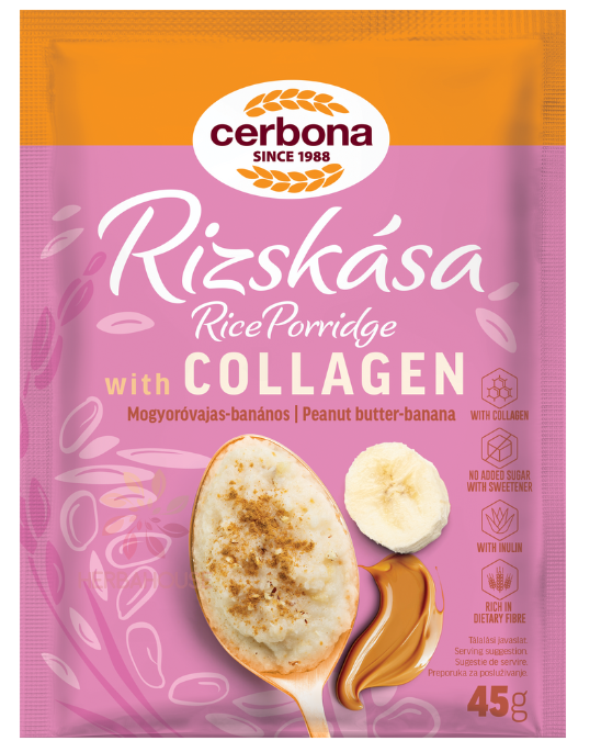 Cerbona Rýžová kaše s kolagenem a inulinem – arašídové máslo a banán je výživná a chutná svačinka, která spojuje jemnou rýžovou mouku, hydrolyzovaný hovězí kolagen a rostlinnou vlákninu inulin. Kaše obsahuje odtučněnou arašídovou mouku, kousky lískových ořechů a lyofilizovaný banán, což dodává lahodnou oříškovou a ovocnou chuť.