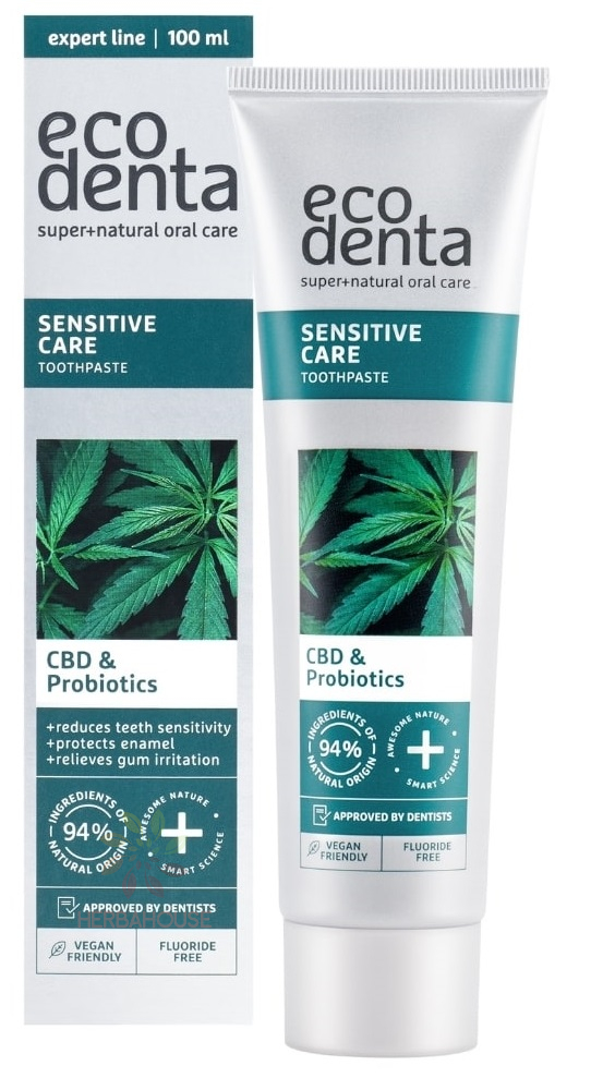EcoDenta Sensitive s CBD a probiotiky pomáhá snižovat nepříjemnou citlivost zubů, minimalizuje riziko podráždění dásní, bojuje proti zubnímu kazu a povlaku a zároveň podporuje přirozenou mikroflóru dutiny ústní. Díky obsahu potassium nitrate a hydroxyapatitu přispívá ke zpevnění skloviny ak dlouhodobějšímu komfortu při konzumaci studených či teplých jídel.