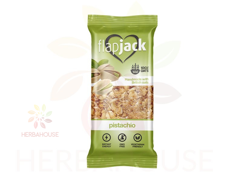 Řemeslná ovesná tyčinka s pistáciemi. Díky své hlavní složce – ovsu – má ovesná tyčinka vysoký obsah vlákniny, proto je vynikajícím doplňkem zdravé stravy. Je vynikající na svačinu nebo odpolední svačinu. Doporučujeme ji i vegetariánům.