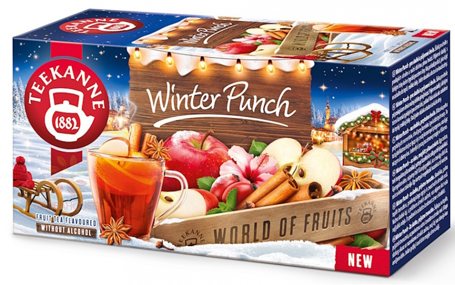 Teekanne Winter Punch je ovocně-bylinný čaj s rumovo-hroznovým aroma a vanilkou, balený ve 20 nálevových sáčcích. Kombinace jablka, ibišku, skořice, šipek, rumovo-hroznového aroma (8%), listů stévie, vanilkového aroma, badyánu a hřebíčku vytváří hřejivý a lahodný nápoj ideální pro zimní večery. Winter Punch přináší sladké a příjemné chvíle – dokonale se hodí k relaxaci při praskajícím ohni nebo pod hvězdnou noční oblohou. Jeho příjemně sladká chuť s lehkými tóny zimního pepře pohladí vaši duši a zahřeje, jako byste se zabaleni do teplé, měkké deky. Stačí jeden doušek a dostaví se kouzlo zimy, které promění každou chvíli v dokonalý relax.